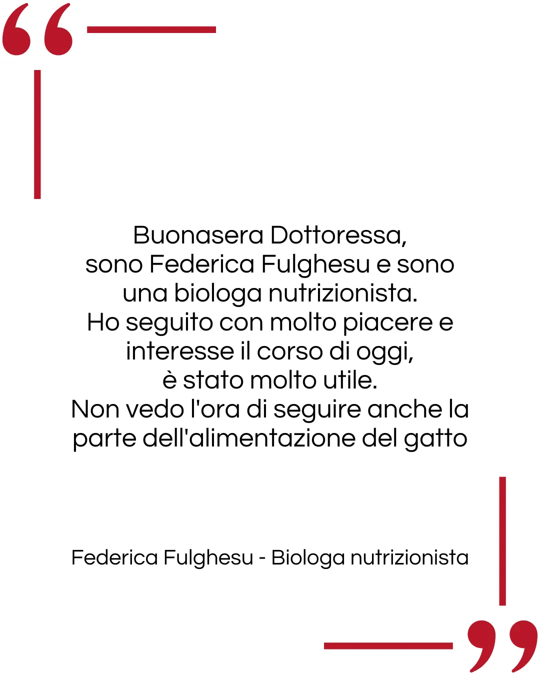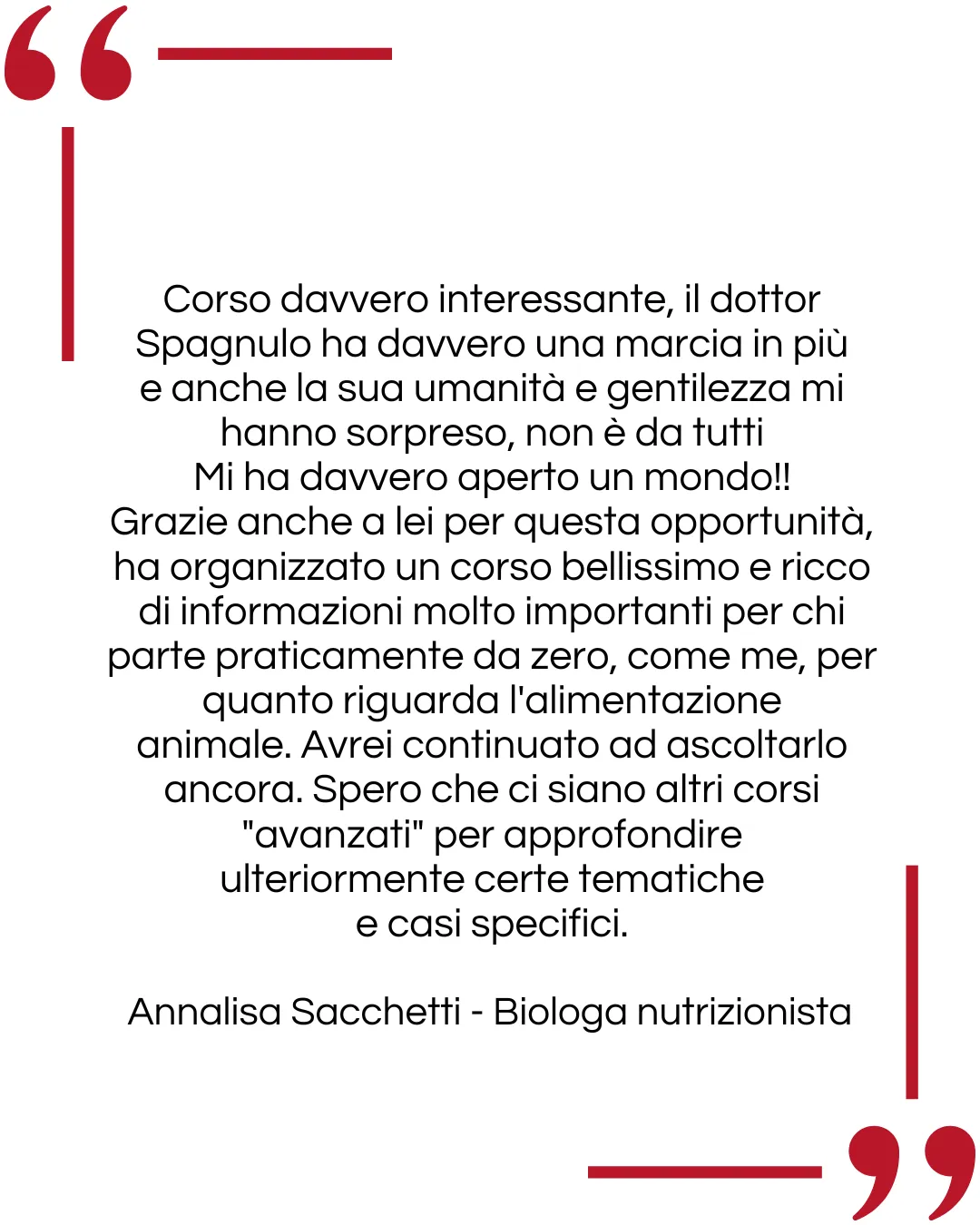A seguire, e per la maggior parte del corso, un biologo nutrizionista, che da 20 anni si occupa di nutrizione e dietetica di cani e gatti e di questo ne ha fatto la propria “missione”.